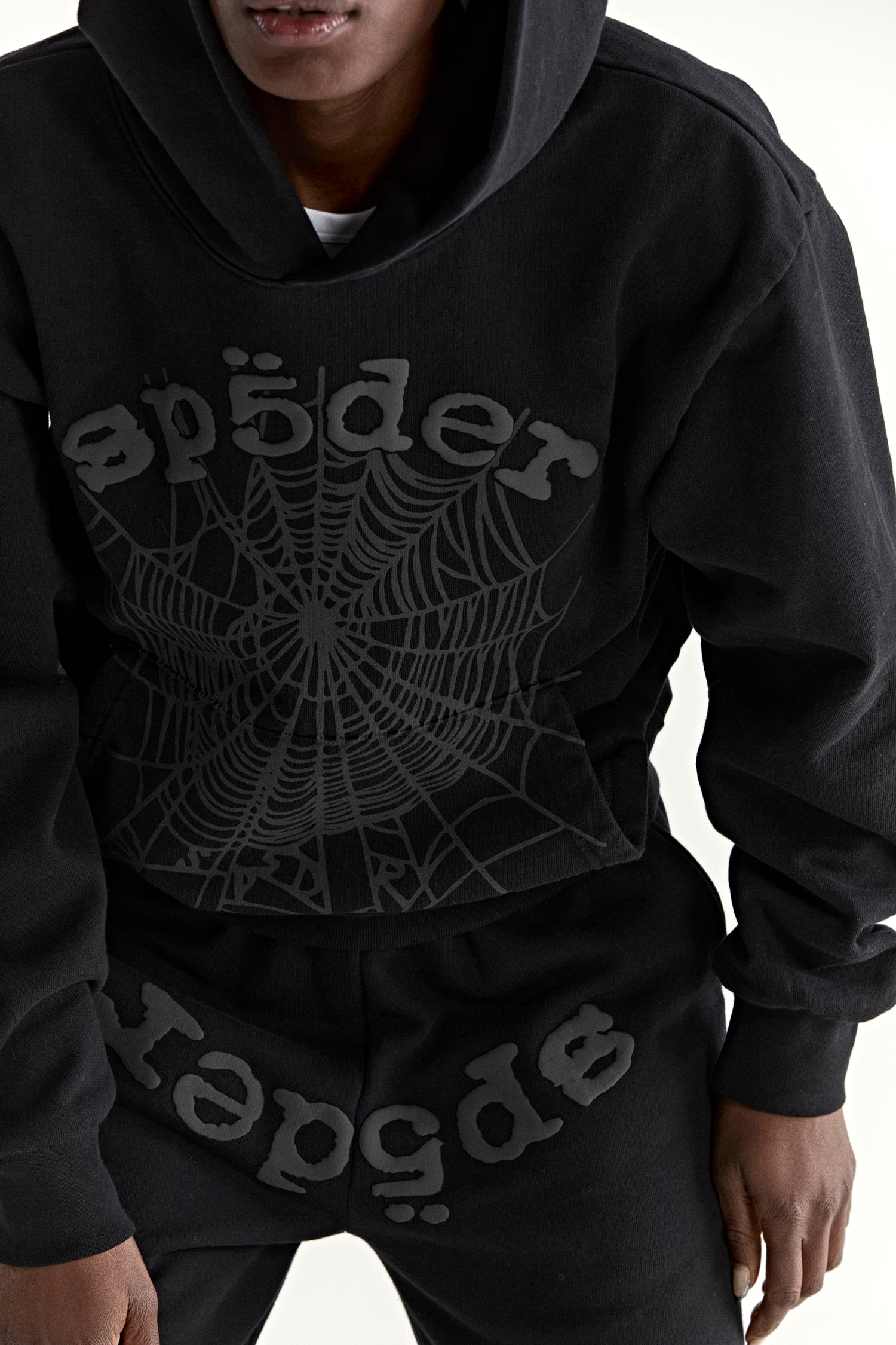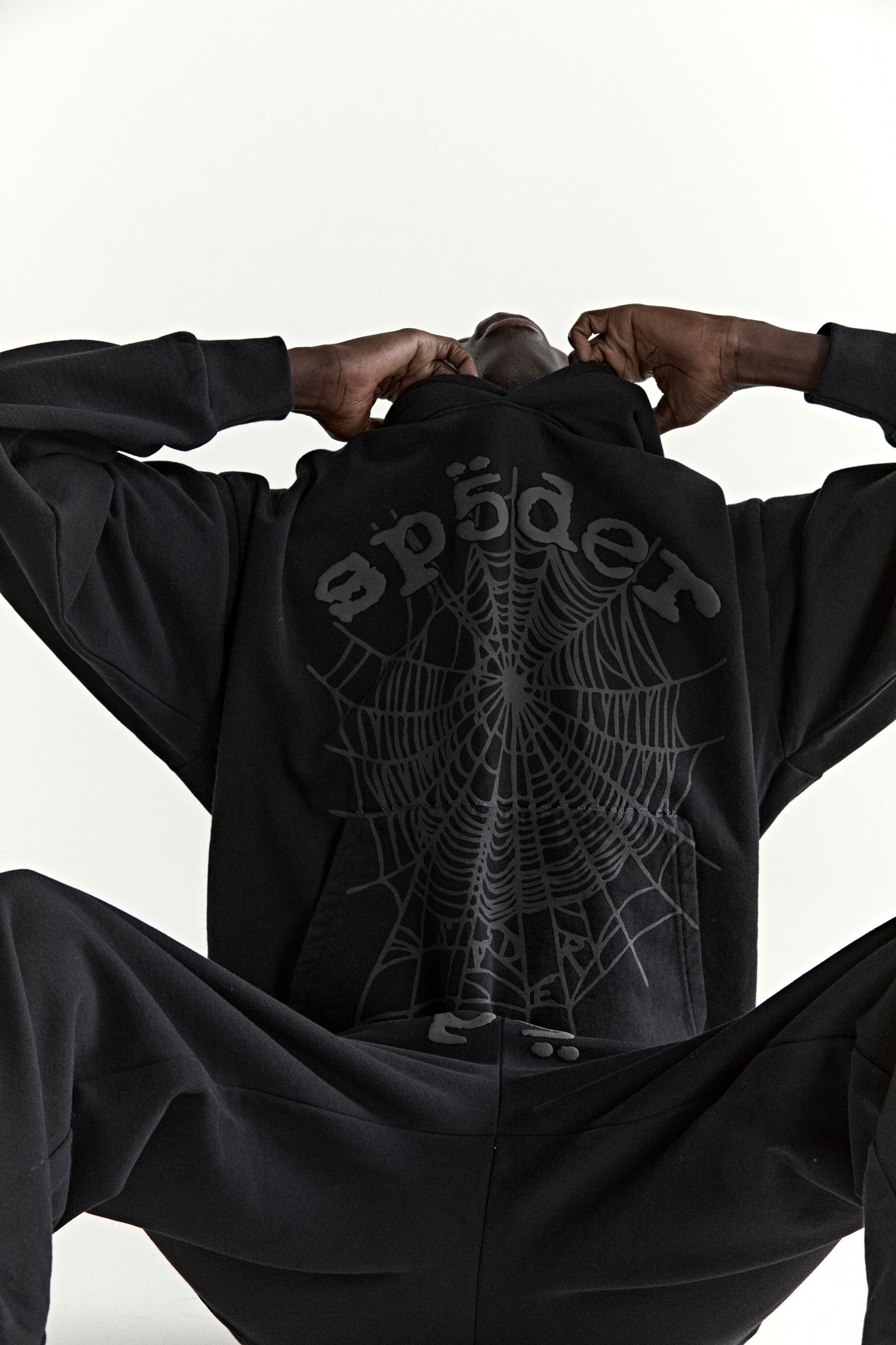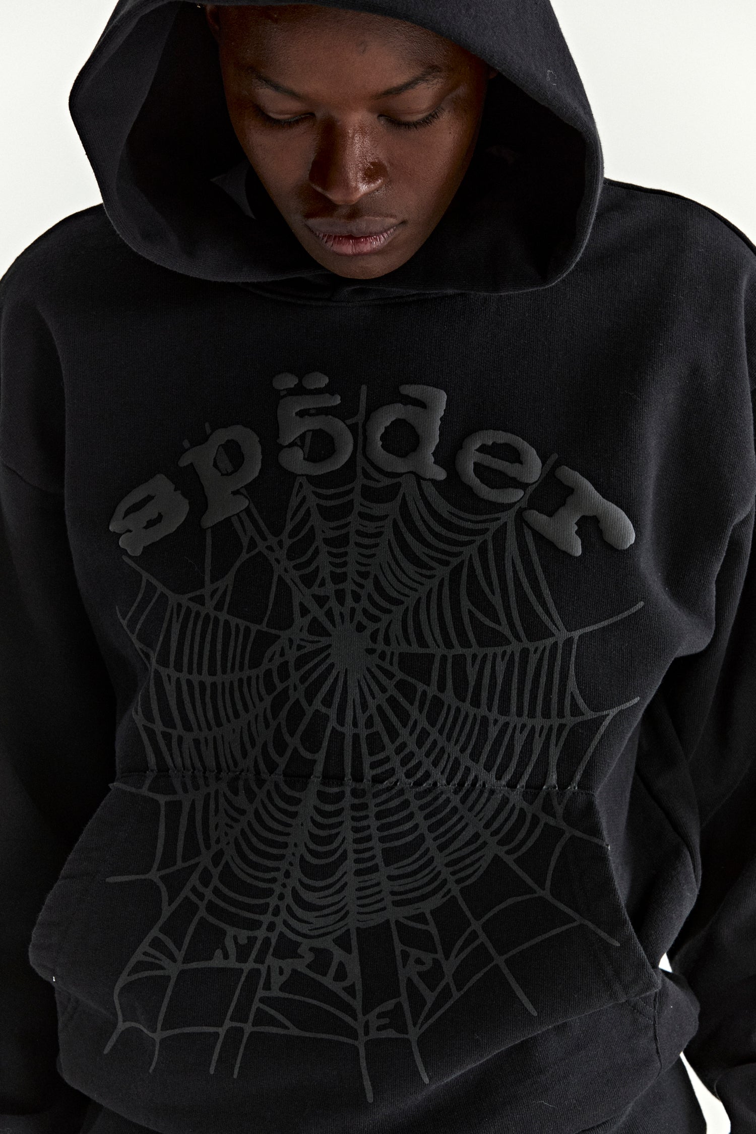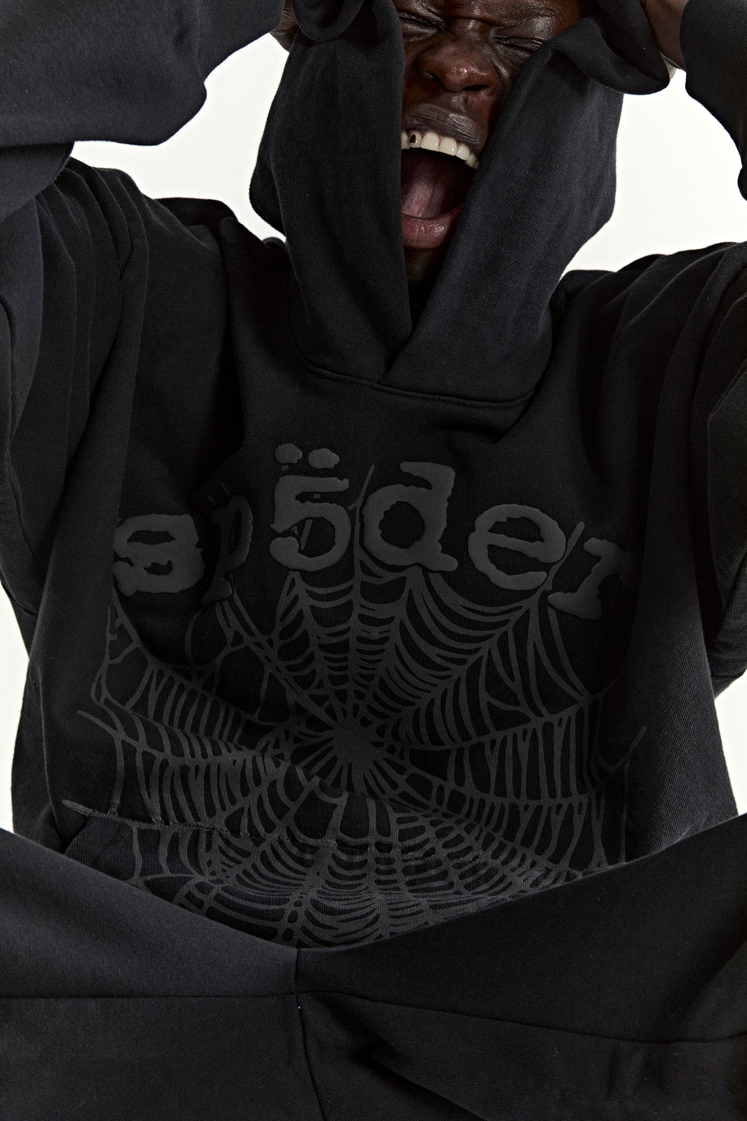 13oz, 100% cotton fleece. Puff print / discharge print combination. Phantom web print on front. Kangaroo pocket. Rib knit hem and cuffs.