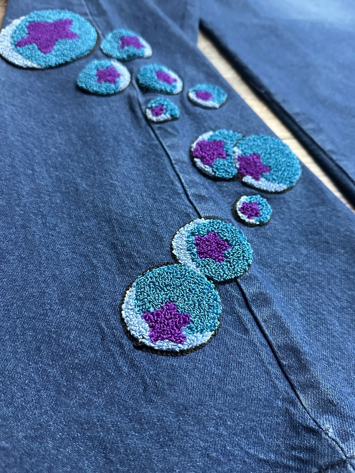 • 100% cotton denim• Loose fit / wide leg cut• Full-leg embroidered "Soft & Wet" bubble trails• Rear patch pockets with anchor stand & star applique